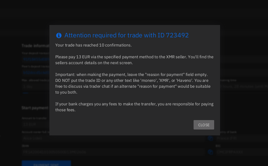 Dans ce tutoriel, nous allons couvrir une transaction SEPA instantanée (qui est un virement bancaire) pour du Monero, c'est l'une des options de paiement les plus populaires dans la région UE. (pour plus de détails sur le fonctionnement de SEPA, consultez cette vidéo). Le SEPA instantané était mon favori personnel sur feu LocalMonero, en raison de la rapidité de la transaction, la seule exigence étant que l'autre pair ait un compte bancaire qui supporte les virements SEPA instantanés.