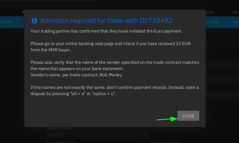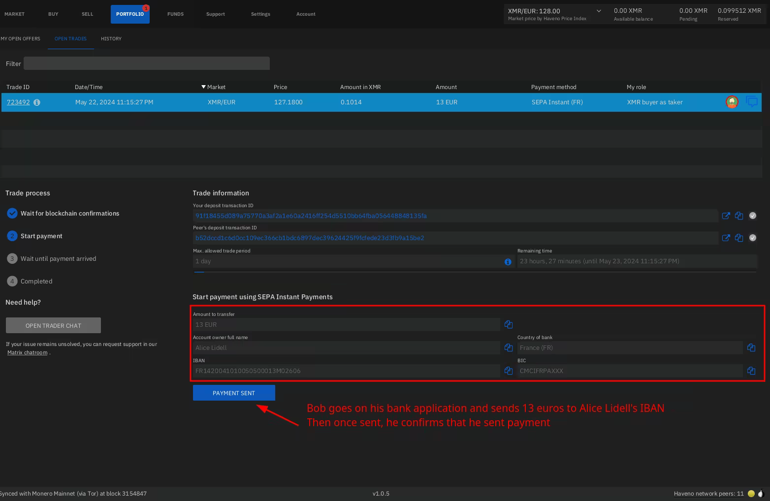 So here Alice checks if she received payment on her account from the bank account of Bob (whose name just got revealed as "Bob Marley" with a specific IBAN) As a Buyer (like Bob), don't try to use a fake IBAN and name because the infos you use are going to be required by the XMR seller (Alice) to verify from whom the payment came from. The Arbitrators are likely to favor Alice if you use false banking information.