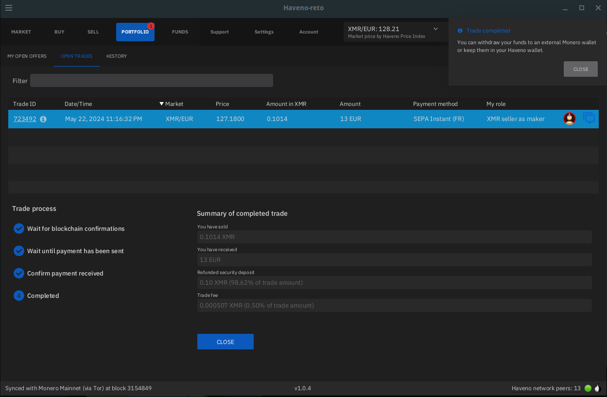 Et ensuite il peut aussi retirer son Monero de son Haveno DEX vers son autre portefeuille Monero comme ceci :