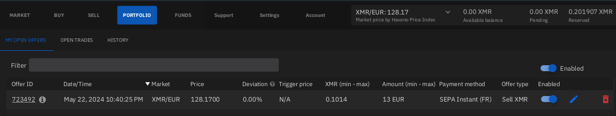 Ensuite Alice crée la nouvelle offre pour vendre ses XMR :