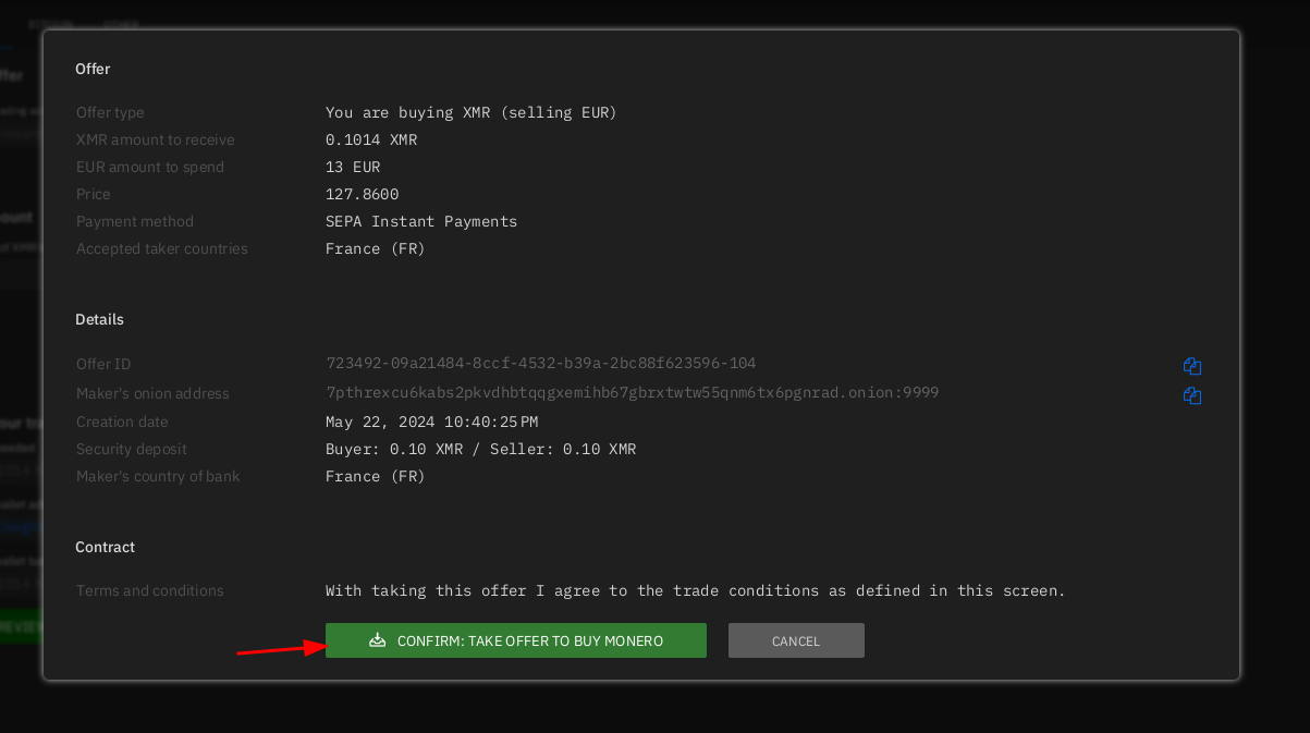 Ici Alice veut vendre 0.1014 XMR au prix du marché actuel (ce qui équivaut à 13 euros), et pour financer son offre au total elle doit mettre 0.201907 XMR car cela inclut sa part du dépôt de garantie.
